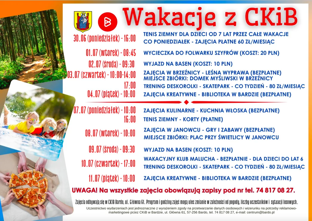 Wszystkie zajęcia odbywają się w siedzibie CKiB przy ul. Głównej 61 w Bardzie, o ile nie zaznaczono inaczej. Uwaga! Na wszystkie zajęcia obowiązują wcześniejsze zapisy pod numerem: 74 817 08 27.