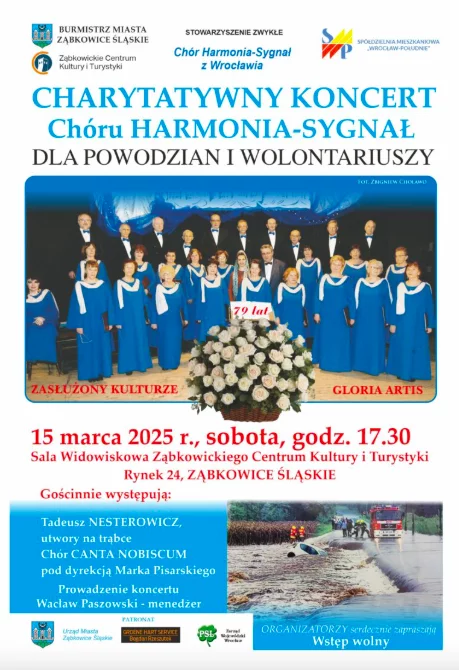 Ząbkowickie Centrum Kultury i Turystyki zaprasza na wyjątkowy charytatywny koncert Chóru Harmonia-Sygnał z Wrocławia, który odbędzie się 15 marca o godzinie 17:30 w sali widowiskowej.