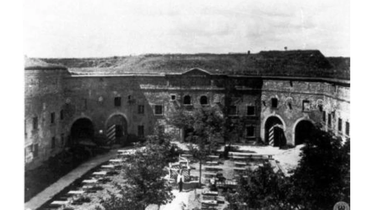 Pozostałe dwa zdjęcia przenoszą nas do wnętrza kompleksu. Oczom ukazuje się rozległy, prostokątny dziedziniec otoczony potężnymi, wielopiętrowymi budynkami. Fasady są proste, ceglane, z licznymi rzędami okien i imponującymi, łukowymi bramami wjazdowymi. Co ciekawe, ten surowy, militarny krajobraz jest przełamany: na dziedzińcu widać liczne ławki ustawione rzędami, małe drzewka oraz zadbany, trawiasty teren, co sugeruje, że miejsce już wtedy pełniło funkcję rekreacyjną lub turystyczną. W centralnym punkcie stoją pojedyncze postacie, ubrane w historyczne stroje, co tylko pogłębia wrażenie podróży w czasie.