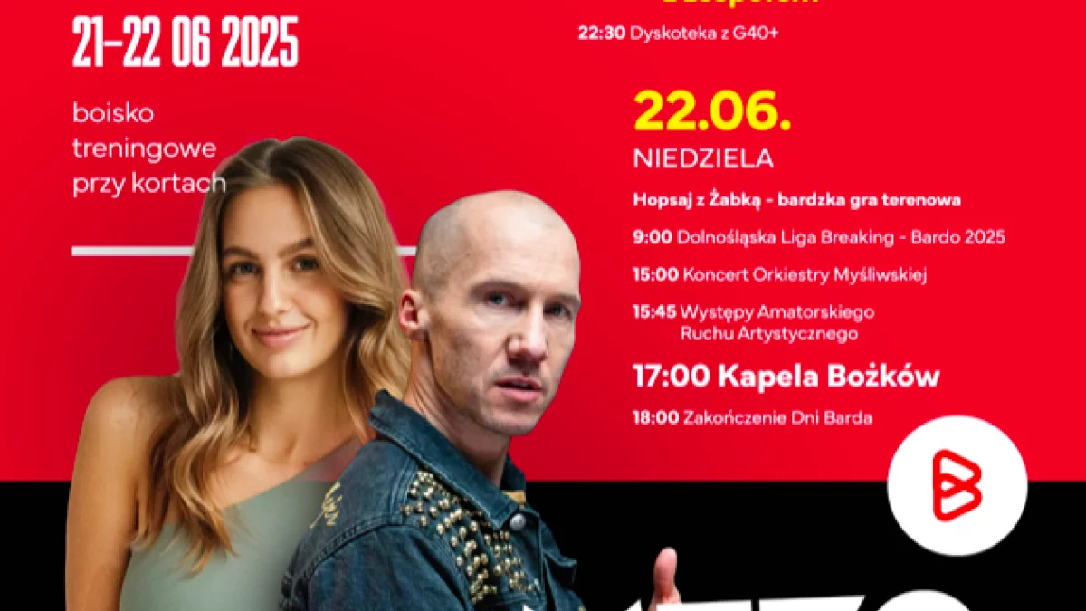 Niedziela (22 czerwca) upłynie pod znakiem sportu i kultury. Od rana trwać będzie terenowa gra miejska „Hopsaj z Żabką – bardzka gra terenowa", a o 9:00 ruszy Dolnośląska Liga Breaking – Bardo 2025. Po południu, o godz. 15.00, wystąpi Orkiestra Myśliwska, a następnie – o 15:45 – swoje umiejętności zaprezentują uczestnicy Amatorskiego Ruchu Artystycznego. O godz. 17.00 sceną zawładnie Kapela Bożków, a finałem wydarzenia będzie uroczyste zakończenie Dni Barda o godzinie 18:00.