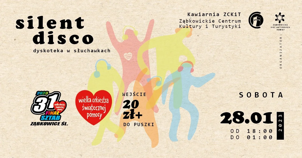 Ciche Disco to impreza dla każdego, kto po prostu lubi tańczyć i dobrze się bawić. Na ząbkowicką potańcówkę zaproszono aż trzech DJ-ów - Lidka Zjankovic z Krakowa, Michał Jabłoński oraz Drum Basstion i Karol Markiel. O ugaszenie pragnienia zadba stoisko Kultura Piwa, na którym będzie można napić się rzemieślniczych browarów regionalnych oraz Prosseco. Silent Disco rozpocznie się o godzinie 18.00, w sobotę, 28 stycznia w Ząbkowickim Centrum Kultury i Turystyki. Koszt wejściówki to min. 20 zł do puszki WOŚP. Aby wypożyczyć słuchawki, należy mieć ze sobą dowód lub inny dokument.
