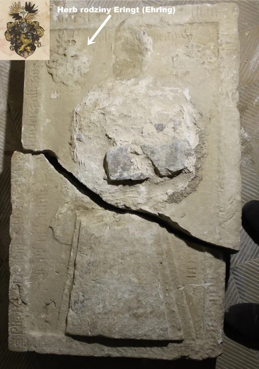Udało się zidentyfikować herb ojca zmarłego dziecka, należący do rodu Eringt (Ehring). Herb matki jest bardzo mocno uszkodzony. Dziecko było więc córką Christophorusa (Krzysztof) Ehring – doktora filozofii i medycyny, działającego później jako medyk we Wrocławiu, a w 1614 r. praktykującego w Ząbkowicach Śląskich, co potwierdzają informacje zawarte na kartach kroniki miasta Martina Koblitza. Jak podaje w swoim dziele „Silesiographia renovata...”, Nicolaus Henel von Hennenfeld, ojciec dziecka zmarł na zarazę w 1633 r., w wieku 63 lat.