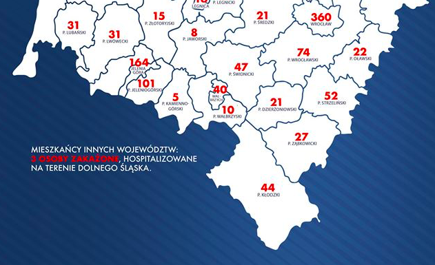 W województwie dolnośląskim nadzorem epidemiologicznym objęto 1363 osób, a kwarantanną lub izolacją - 4411. Hospitalizowanych ze względu na podejrzenie lub potwierdzenie zachorowania na COVID-19 na całym Dolnym Śląsku jest 359 osób.