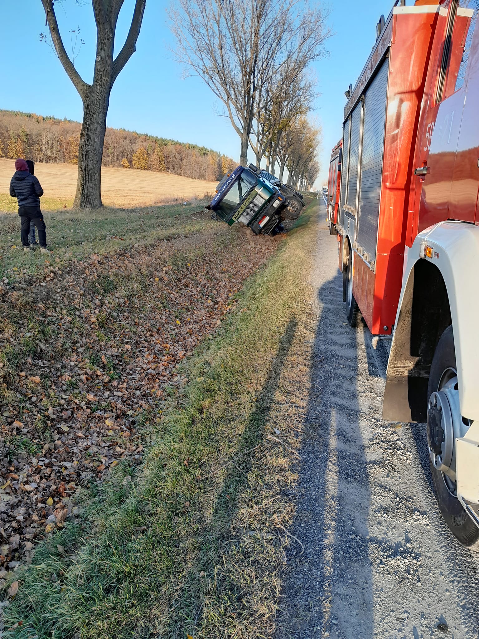 Na plamę najechał samochód ciężarowy marki Man, który wpadł w poślizg i wylądował do przydrożnego rowu.