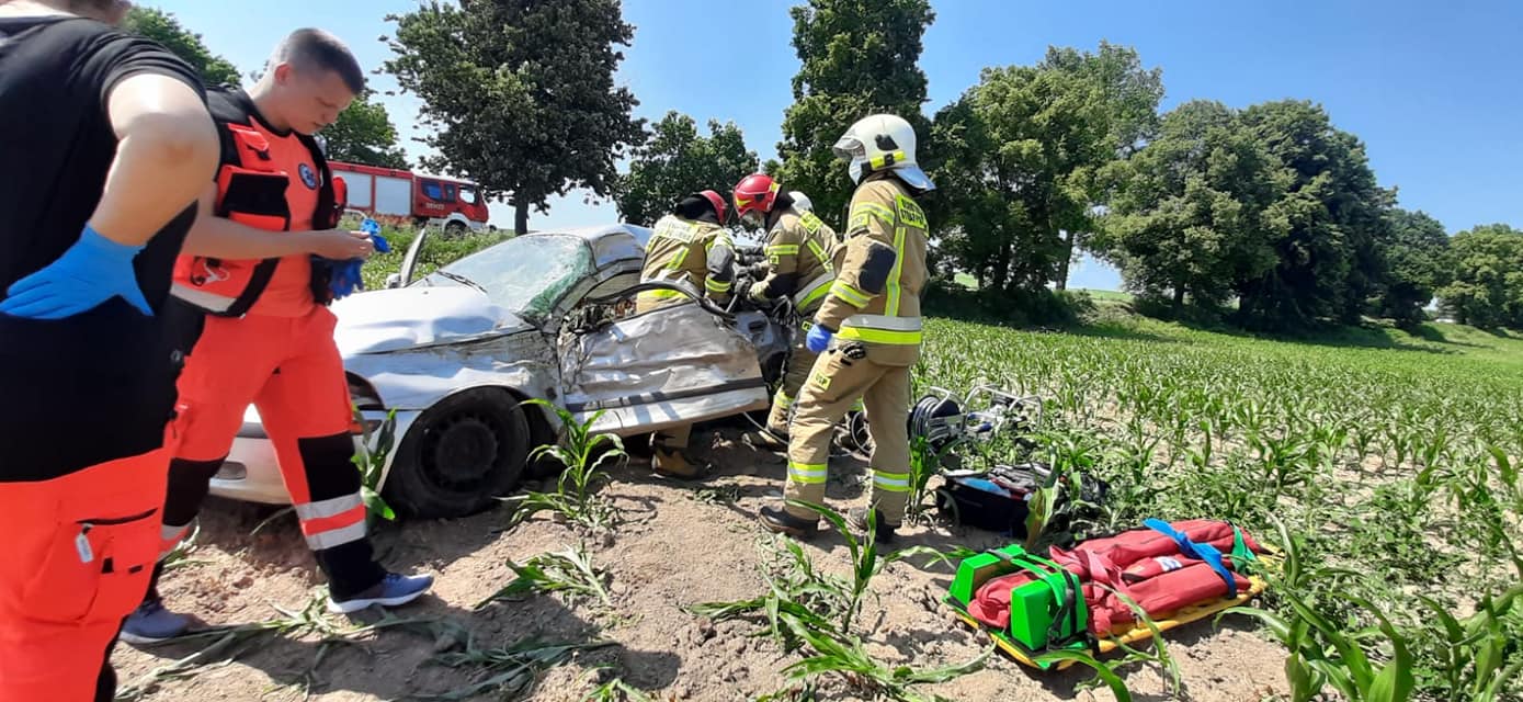 O godzinie 14.08 strażacy z Komendy Powiatowej Straży Pożarnej w Ząbkowicach Śląskich dostali zgłoszenie o wypadku samochodu osobowego na drodze w kierunku Kazanowa, za Wadochowicami. Kierujący samochodem osobowym marki Volvo stracił panowanie nad pojazdem i wypadł z drogi. W pojeździe znajdowała się jedna osoba, mężczyzna był przytomny, a auto stało na kołach w przydrożnym polu. Poszkodowany miał widoczne obrażenia lewej ręki i w momencie przyjazdu strażaków był zakleszczony w samochodzie. Działania strażaków polegały na zabezpieczeniu miejsca zdarzenia, wykonaniu dostępu do kierującego przy pomocy narzędzi hydraulicznych oraz udzieleniu mu pierwszej pomocy do czasu przyjazdu zespołu ratownictwa medycznego. Ewakuowany z pojazdu mężczyzna został przekazany ratownikom medycznym i przewieziony do szpitala. Na miejscu pracowała policja, karetka oraz 3 zastępy straży pożarnej z OSP Henryków, PC JRG Ziębice i JRG Ząbkowice Śląskie.