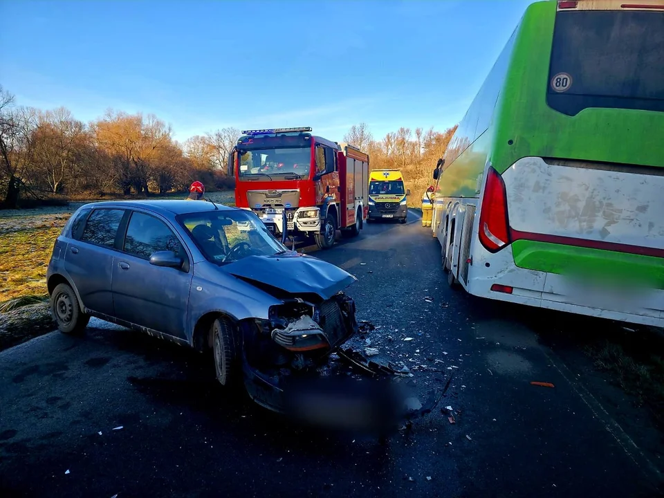 Gmina Ziębice. Policjanci ustalili, że 38-letnia mieszkanka powiatu ząbkowickiego, prowadząca samochód marki Chevrolet, na łuku drogi straciła panowanie nad pojazdem. Samochód wpadł w poślizg i zjechał na przeciwległy pas ruchu, gdzie doszło do zderzenia z autobusem, którym kierował 58-letni mężczyzna. Na szczęście w chwili zdarzenia w autobusie nie było pasażerów – znajdował się w nim tylko kierowca.