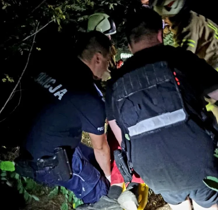 Mundurowi cały czas utrzymując słowny kontakt z poszkodowanym wezwali na miejsce Pogotowie i Straż Pożarną by bezpiecznie przenieść 38-latka do karetki