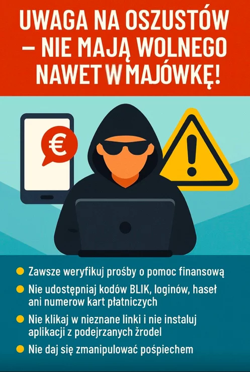 Wraz z nadejściem długiego majowego weekendu wielu z nas planuje wypoczynek na działce, nad wodą czy w gronie rodziny i znajomych. Grill, relaks na leżaku, odcięcie się od codziennego stresu – wszystko to sprzyja wyciszeniu. Niestety, również... utracie czujności. A to idealna okazja dla oszustów.