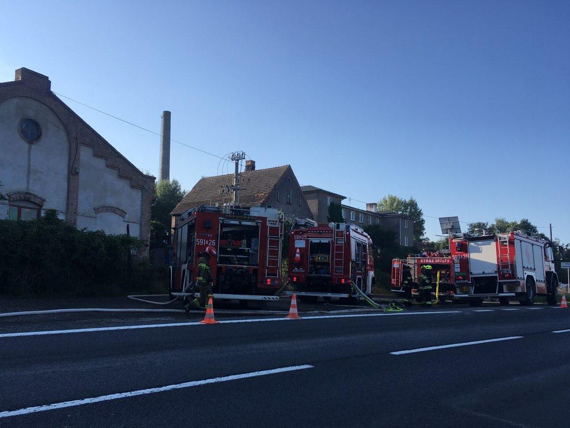 Szklary. Kilkanaście zastępów straży pożarnej gasi pożar zabudowań na terenie byłej huty przy krajowej ósemce.