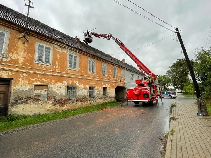 W poniedziałek, 22 sierpnia w Mąkolnie uszkodzony komin spadł na jezdnię. Pozostałość niestabilnego przewodu strażacy usunęli przy użyciu podnośnika.