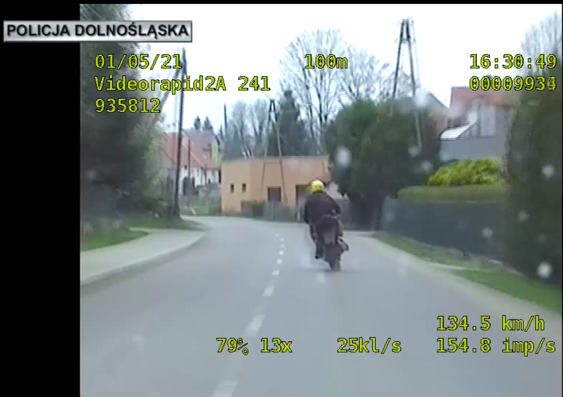 Policjanci rozpoczęli pościg, w czasie którego motocyklista jechał z prędkością nawet 124 km/h w obszarze zabudowanym. Funkcjonariusze zatrzymali go kilka kilometrów dalej skutecznie uniemożliwiając dalszą jazdę. Za kierownicą pojazdu siedział 22-letni mieszkaniec powiatu ząbkowickiego. Nie posiadał uprawnień do kierowania oraz miał orzeczone zakazy prowadzenia pojazdów do dwóch różnych spraw. Ponad to motocykl, którym mężczyzna się poruszał nie był ubezpieczony ani zarejestrowany.