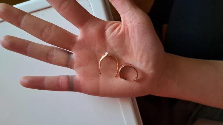 Sprawdzenie nawrotu kapilarnego i pierwsza próba ,,na nitkę”, jednak opuchlizna jest na tyle duża, że próba niestety się nie udaje. Pozostaje nam tylko cięcie. Za pomocą kleszczy do przecinania obrączek usuwamy pierścionki z opuchniętych palców i kończymy działania - podsumowuje młodszy kapitan Gomółka.