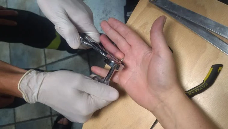 Jaki to problem? Na opuchniętym palcu kobiety znajduje się pierścionek zaręczynowy, którego nie może ona zdjąć. Pierścionek zaręczynowy to przedmiot o dużej wartości sentymentalnej, więc strażacy próbują najpierw sposobu na „sznurek”. Opuchlizna jednak była zbyt duża, nie pozwoliła na zdjęcie biżuterii.