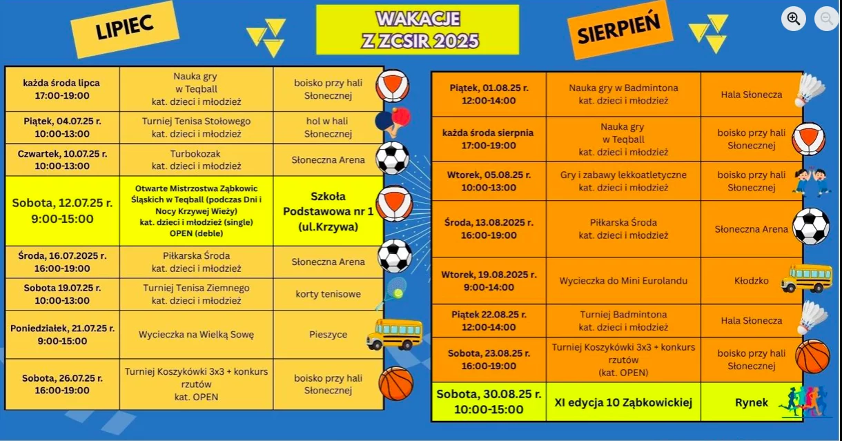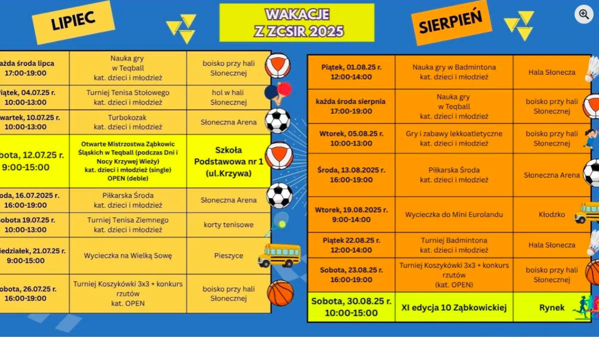 Program „Wakacje z ZCSiR 2025" to propozycja dla wszystkich, którzy chcą aktywnie i ciekawie spędzić lato w Ząbkowicach Śląskich. W lipcu i sierpniu przygotowano liczne turnieje, zajęcia sportowe, wycieczki i wydarzenia rekreacyjne.