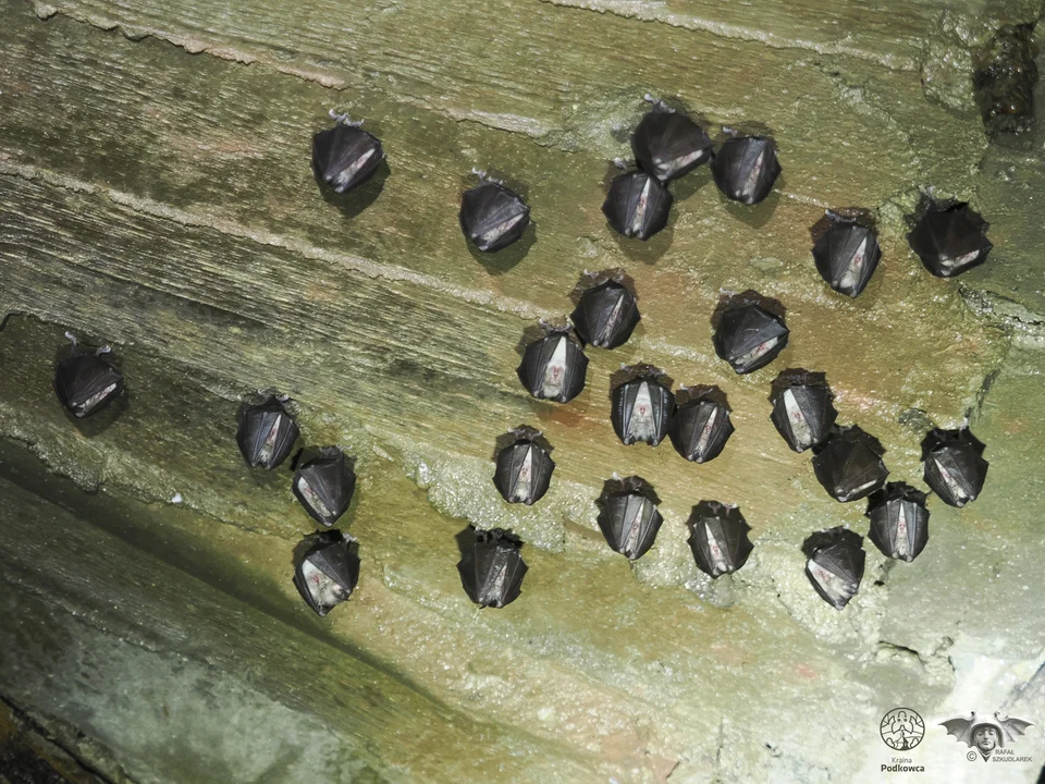 Na fotografii: zimujący nocek duży, trzeci co do liczebności gatunek korzystający ze sztolni w Młotach.