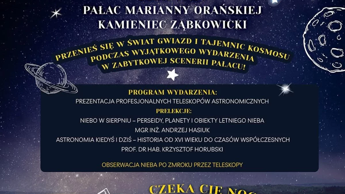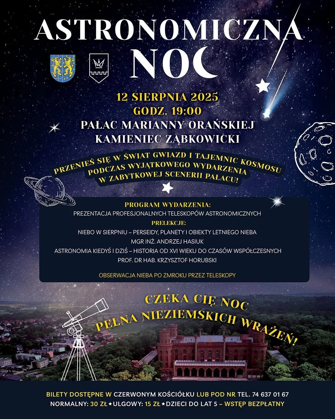 Astronomiczna Noc to niepowtarzalna okazja, by połączyć fascynację nauką z magią historycznego miejsca. Mieszkańców i turystów czeka noc pełna nieziemskich wrażeń, wiedzy, obserwacji nieba i wyjątkowej atmosfery. 12 sierpnia – zapisz tę datę i daj się porwać gwiazdom!