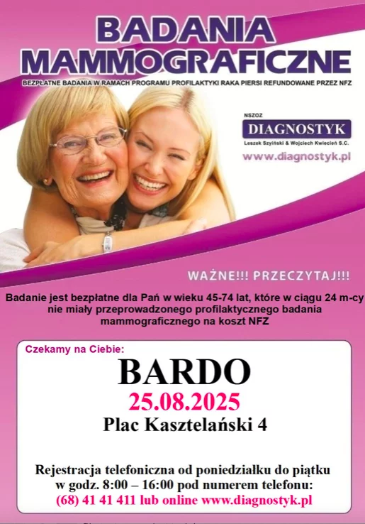 Badania odbędą się na Placu Kasztelańskim 4 w Bardzie. Rejestracja jest możliwa telefonicznie od poniedziałku do piątku w godzinach 8:00–16:00 pod numerem (68) 41 41 411 lub online na stronie www.diagnostyk.pl.