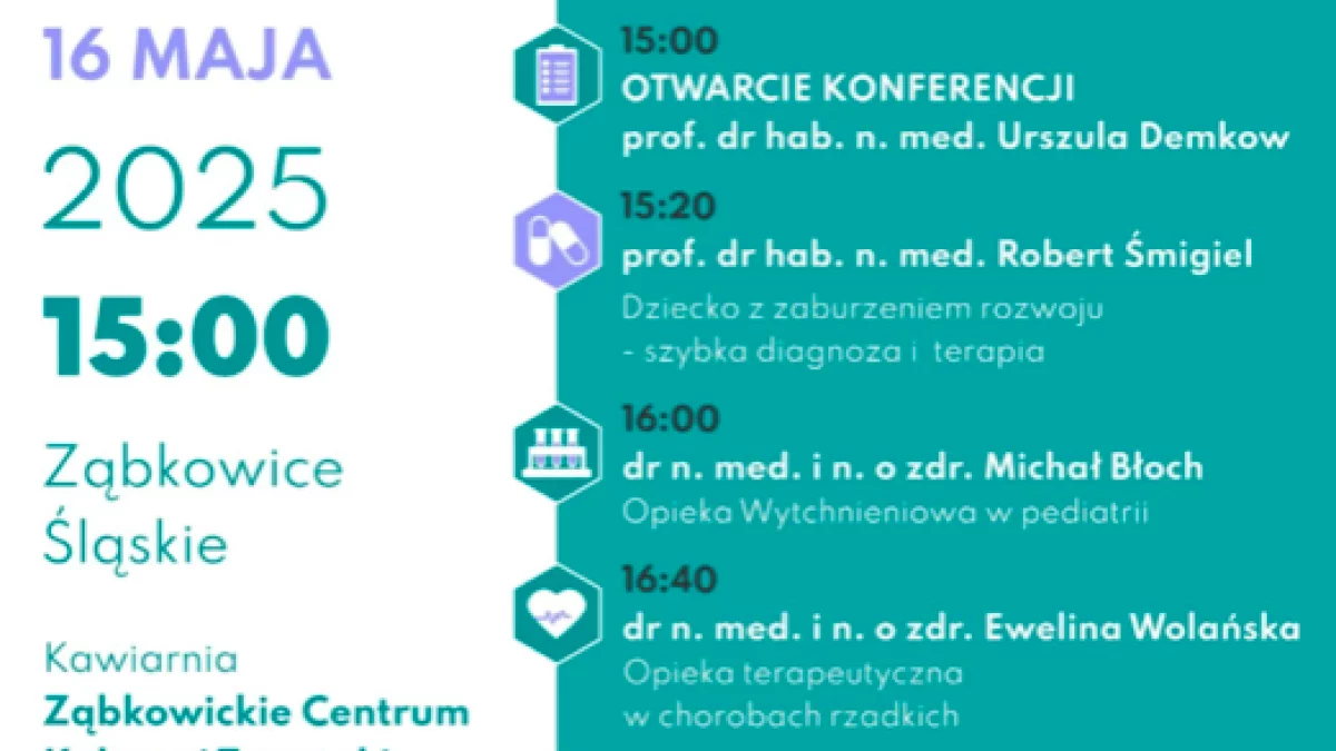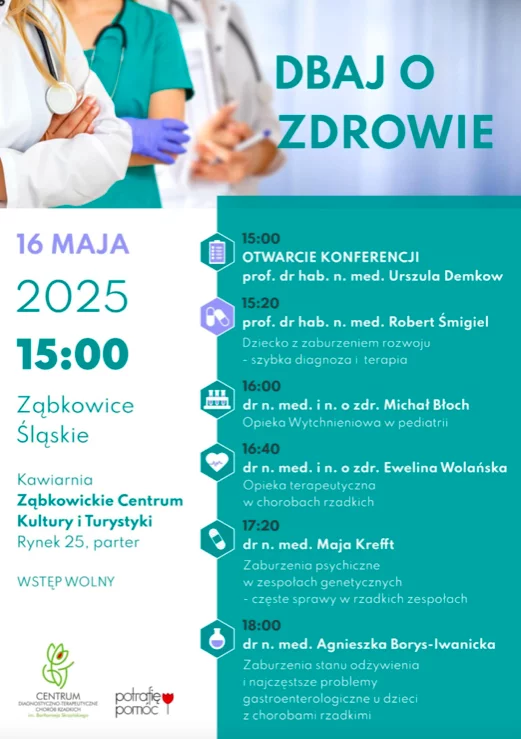 Już 16 maja o godzinie 15.00 w Ząbkowickim Centrum Kultury i Turystyki (Rynek 25, parter) odbędzie się otwarta konferencja poświęcona zdrowiu, organizowana pod hasłem „Dbaj o zdrowie". To wyjątkowe wydarzenie skierowane jest do wszystkich, którzy chcą poszerzyć swoją wiedzę na temat zdrowia dzieci, opieki medycznej oraz nowoczesnych terapii.