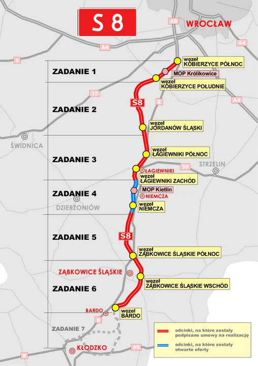 Dolnośląski odcinek drogi S8 między Wrocławiem a Bardem liczy blisko 64 km. Jego realizacja została podzielona na 6 krótszych fragmentów. W grudniu 2023 GDDKiA podpisała umowy na realizację pierwszych trzech odcinków od Kobierzyc do Łagiewnik o łącznej długości 33 km. W czerwcu 2024 natomiast zawarto porozumienie o budowie fragmentu pomiędzy Ząbkowicami Śląskimi a Bardem. Na ostatni odcinek – między Łagiewnikami a Niemczą – zaplanowano podpisanie umowy jeszcze w tym roku.To jednak nie koniec inwestycji. W trakcie przygotowania jest także dokumentacja przetargowa na wykonanie Studium techniczno-ekonomiczno-środowiskowego dla odcinka S8 między Bardem a Kłodzkiem. To dokument konieczny, aby móc wdrożyć w życie kolejne fazy realizacji i przejść do budowy. Zakończenie całej drogi od Wrocławia do Kłodzka planowane jest w latach 2028-2033. W planie jest również realizacja jej dalszego przebiegu, aż do Boboszowa i granicy z Czechami.