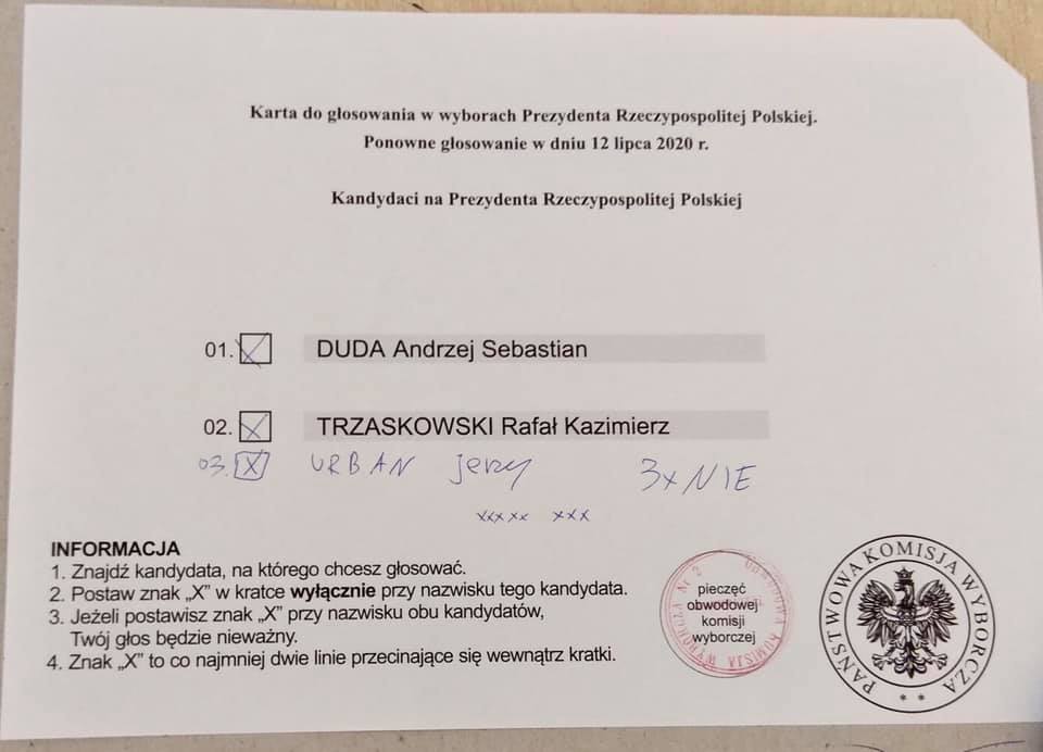W całym kraju na niektórych kartach wrzucanych do urn pojawiły się dopiski i malunki. Kodeks wyborczy jasno podaje, że „dopisanie na karcie do głosowania dodatkowych numerów list i nazw lub nazwisk albo poczynienie innych dopisków poza kratką nie wpływa na ważność oddanego na niej głosu”. Warunkiem oddania ważnego głosu jest bowiem postawienie krzyżyka przy nazwisku wybranego kandydata oraz widoczność pieczęci. Głos był uznawany za nieważny, jeśli na karcie wyborczej był więcej niż jeden znak „X” w przeznaczonych do tego kratkach lub jeśli w żadnej kratce „X” nie było. Zgodnie z nowelizacją kodeksu wyborczego znak „X” to „co najmniej dwie linie, które przecinają się w obrębie kratki”.