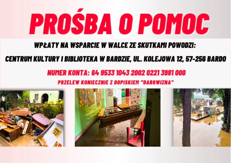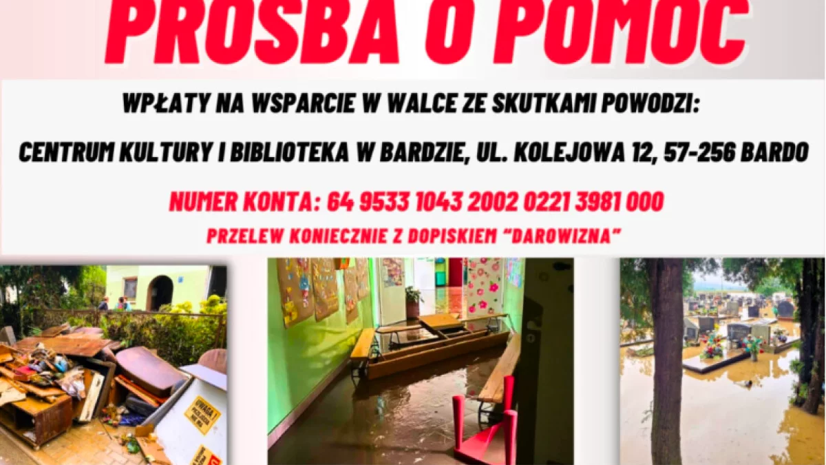 - Zwracamy się do Państwa, ludzi o wielkich sercach, z apelem o pomoc w obliczu tragicznych skutków powodzi, która dotknęła teren naszej Gminy Bardo. Straty, które ponieśliśmy, są ogromne i przerastają nasze możliwości samodzielnego ich naprawienia. Dlatego też prosimy o wsparcie finansowe lub przekazanie materiałów budowlanych, narzędzi, urządzeń i artykułów wyposażenia, które są niezbędne do odbudowy naszych domów i zabezpieczenia ich przed nadchodzącą zimą - apelują w imieniu mieszkańców urzędnicy z bardzkiego magistratu.