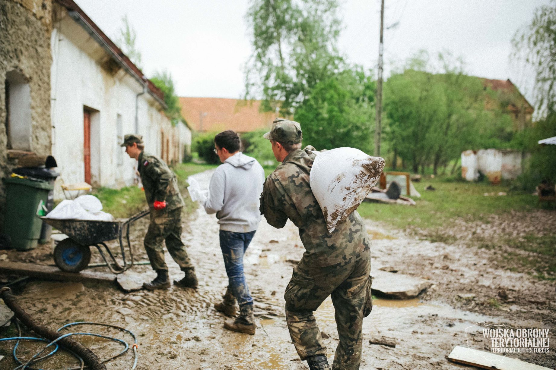 Na pomoc po nawałnicy do gminy Ciepłowody przyjechało ponad 20 żołnierzy 16. Dolnośląskiej Brygady Obrony Terytorialnej. Żołnierze zabezpieczali domy, gdzie wylała rzeka Ślęża i zbiornik wód opadowych. - Działania żołnierzy polegały przede wszystkim na udzieleniu pomocy mieszkańcom miejscowości Ciepłowody, która po wylaniu niewielkiej rzeki, została podtopiona. Ucierpiały zabudowy jednorodzinne i mieszkania, znajdujące się tuż przy rzece. Woda przelała się przez kilka lokali mieszkalnych, które zostały kompletnie zniszczone i zabłocone - poinformowała kpt. Renata Mycio. Terytorialsi pomagali również właścicielom w wynoszeniu zalanych i zniszczonych mebli oraz układali worki z piachem w miejscach, gdzie wezbrana woda wystąpiła z koryta.