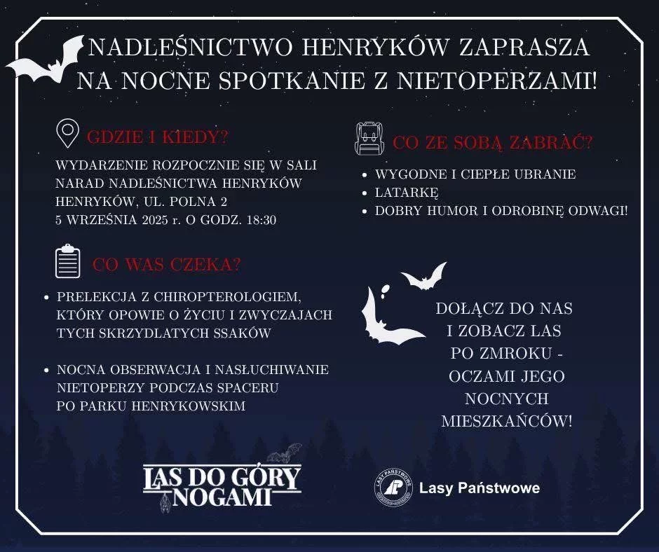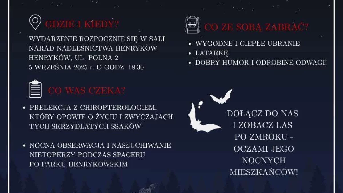 Nadleśnictwo Henryków zaprasza na wyjątkowe wydarzenie, podczas którego będzie można odkryć tajemnice nocnych mieszkańców lasu. Już 5 września o godz. 18:30 w sali narad Nadleśnictwa Henryków rozpocznie się spotkanie poświęcone nietoperzom, zakończone nocną obserwacją w terenie.