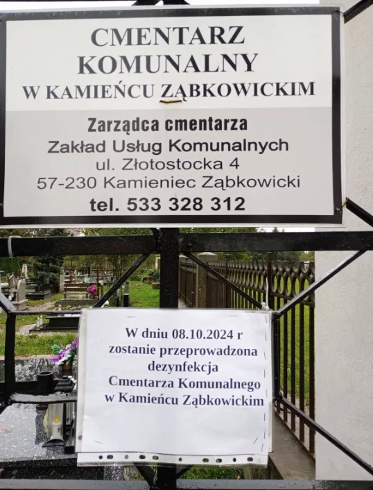 We wtorek, 8 października zostanie przeprowadzona dezynfekcja Cmentarza Komunalnego w Kamieńcu Ząbkowickim przez Dezynfekcyjny Zespół Zadaniowy z 4. Brodnickiego Pułku Chemicznego im. Ignacego Mościckiego.