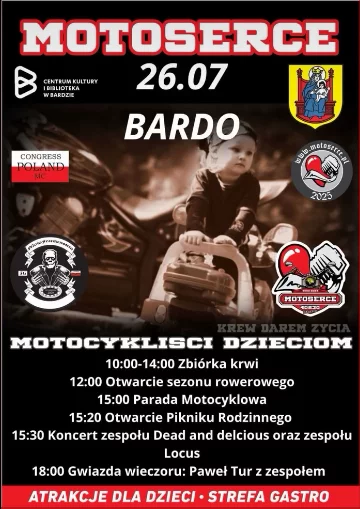 Już 26 lipca Bardo stanie się motocyklową stolicą regionu! Wszystko za sprawą akcji Motoserce 2025, organizowanej przez grupę MotoFrankenstein FG Ząbkowice Śląskie oraz Centrum Kultury i Bibliotekę w Bardzie. To wydarzenie, które łączy miłość do motocykli z pomocą potrzebującym. W tym roku pod hasłem „Motocykliści dzieciom".