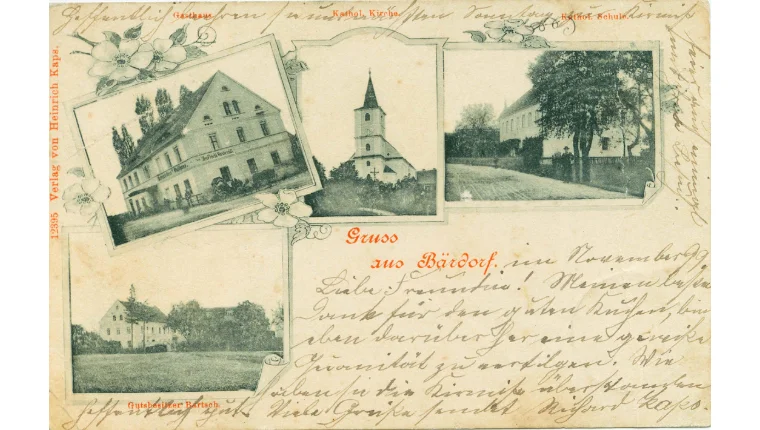 Na dzisiejszej karcie pocztowej, ukazano kościół katolicki pw. śś. Szymona i Tadeusza wzmiankowany już w 1356 r., budynek szkoły katolickiej, miejscową gospodę oraz zabudowania gospodarcze rodziny Bartsch.