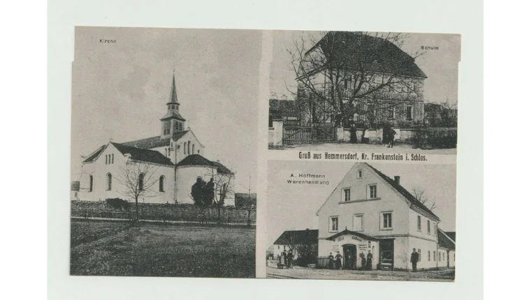 Zamieszczono na niej widok kościoła św. Katarzyny, rozbudowanego do obecnej formy w latach 1853-1854, jak także szkoły katolickiej oraz sklepu A. Hoffmanna.