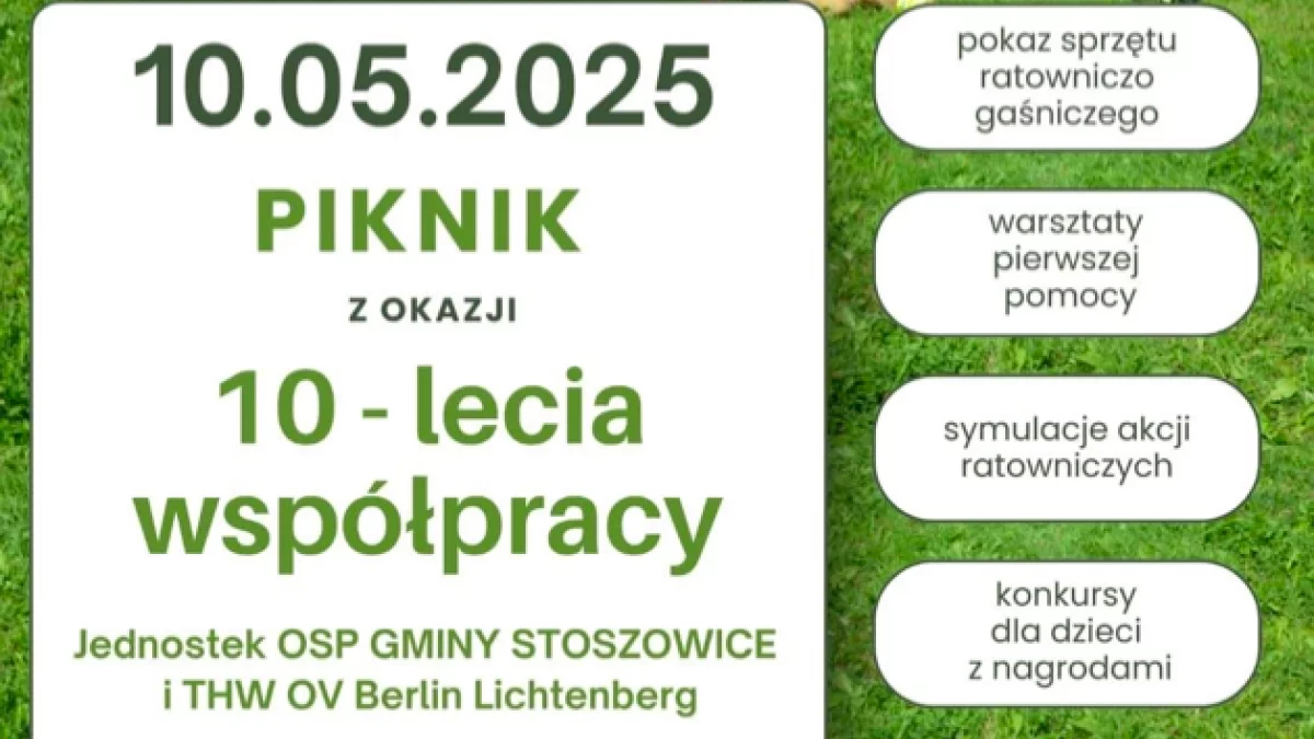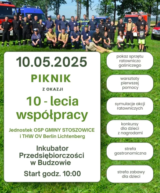 Już 10 maja o godzinie 10.00 w Inkubatorze Przedsiębiorczości w Budzowie odbędzie się wyjątkowy piknik z okazji 10-lecia współpracy jednostek Ochotniczej Straży Pożarnej Gminy Stoszowice oraz THW OV Berlin Lichtenberg.