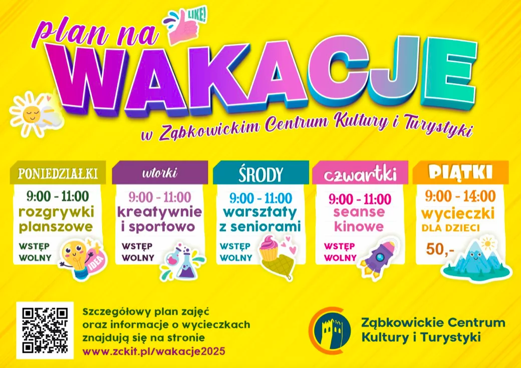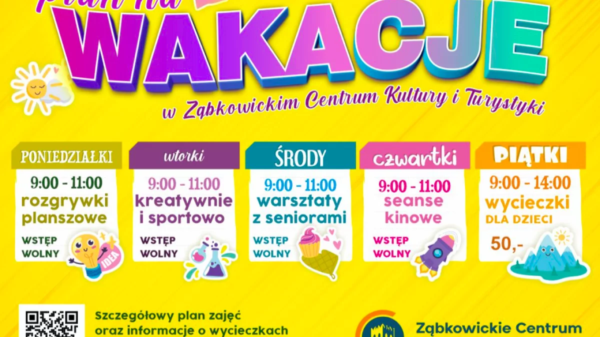 Ząbkowickie Centrum Kultury i Turystyki zaprasza wszystkie dzieci do wspólnego spędzenia wakacji. Przygotowano bogaty program pełen atrakcji, warsztatów i aktywności, które będą odbywać się od poniedziałku do piątku w ZCKiT.