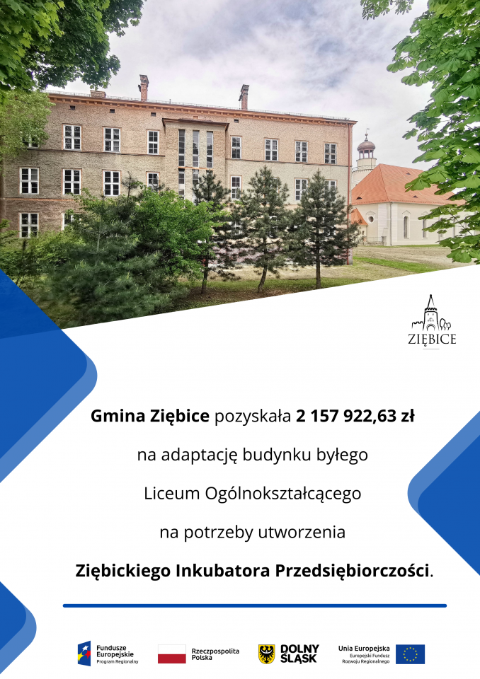 Gmina Ziębice pozyskała 2 157 922,63 zł na adaptację budynku po byłym Liceum Ogólnokształcącym. Zostanie w nim utworzony Ziębicki Inkubator Przedsiębiorczości.