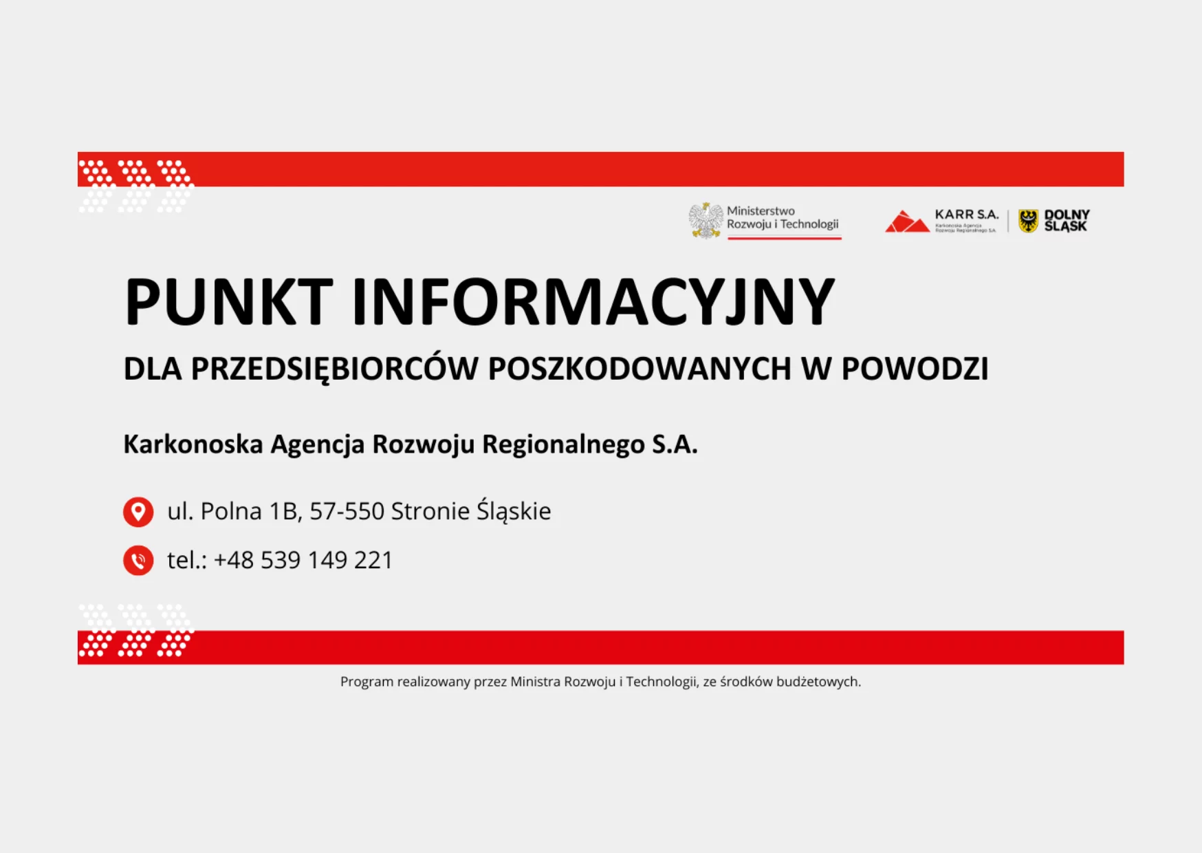 W celu ułatwienia kompletowania dokumentów oraz składania wniosków o ubieganie się o pomoc finansową pochodzącą ze środków Ministerstwa Rozwoju i Technologii, przedsiębiorcy mogą udać się bezpośrednio do biura na terenie Ziemi Kłodzkiej.
