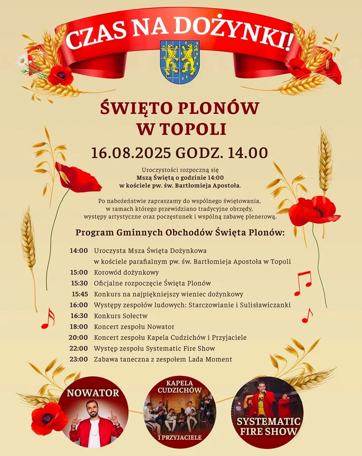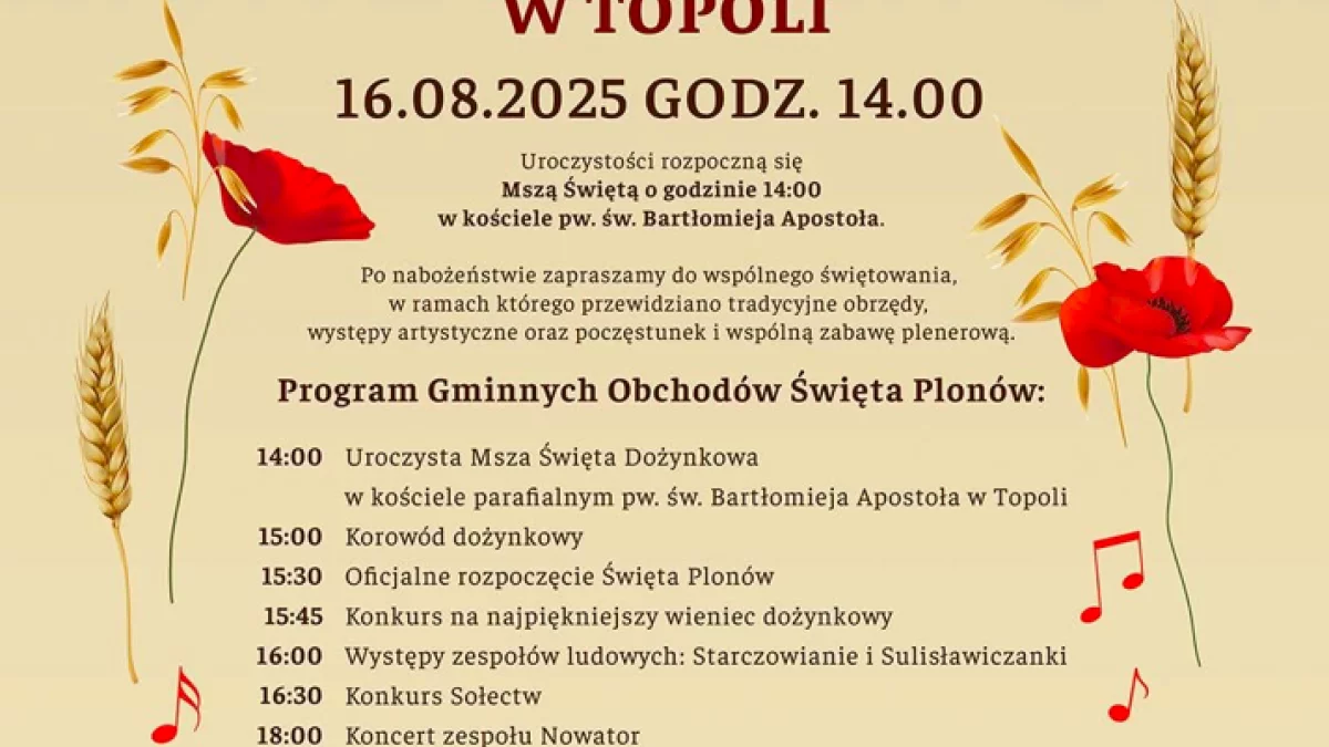 Święto Plonów w Topoli to wyjątkowa okazja do kultywowania tradycji, integracji społeczności i wspólnej zabawy. Po zakończeniu Mszy Świętej odbędzie się barwny korowód dożynkowy oraz oficjalne rozpoczęcie uroczystości.