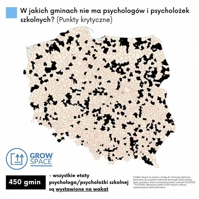 Zgodnie z wyliczeniami w Polsce brakuje 27,32% psychologów i psycholożek szkolnych na rok szkolny 2023/24. Fundacja GrowSPACE wystosowała zapytanie dotyczące liczby planowanych etatów, obsadzonych etatów oraz wakatów psychologów szkolnych do wszystkich gmin, powiatów oraz miast na prawach powiatów w Polsce. Odpowiedzi udzieliło 91% samorządów w Polsce, a informacje pochodzą z zatwierdzonych arkuszy organizacyjnych szkół publicznych.