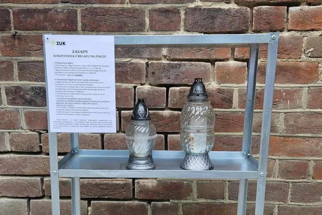 Ziębice. Przy kaplicy cmentarnej pojawił się regał na znicze. Jeśli nie potrzebujemy znicza, jest on bezużyteczny, nie wyrzucajmy go do kosza, ale zostawmy na regale. Być może ktoś skorzysta, zaoszczędzi pieniądze i przy okazji ochroni środowisko.