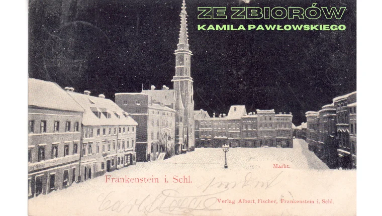 Dzisiejsza kartka, która ukazała się nakładem Alberta Fischera z Ząbkowic Śląskich przedstawia ząbkowicki Rynek pokryty śniegową pierzynką, zimową, nocą porą.
