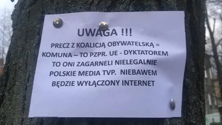 Wiadomość na kartce zaczyna się od słowa „uwaga” z trzema wykrzyknikami. Dalej mamy: „Precz z Koalicja Obywatelską = komuna - to PZPR. UE - dyktatorem. To oni zagarnęli nielegalnie polskie media TVP. Niebawem będzie wyłączony internet”. Przekaz - przyznajemy - groźny. Ale też mało poważny. I dlaczego nie podpisany?
