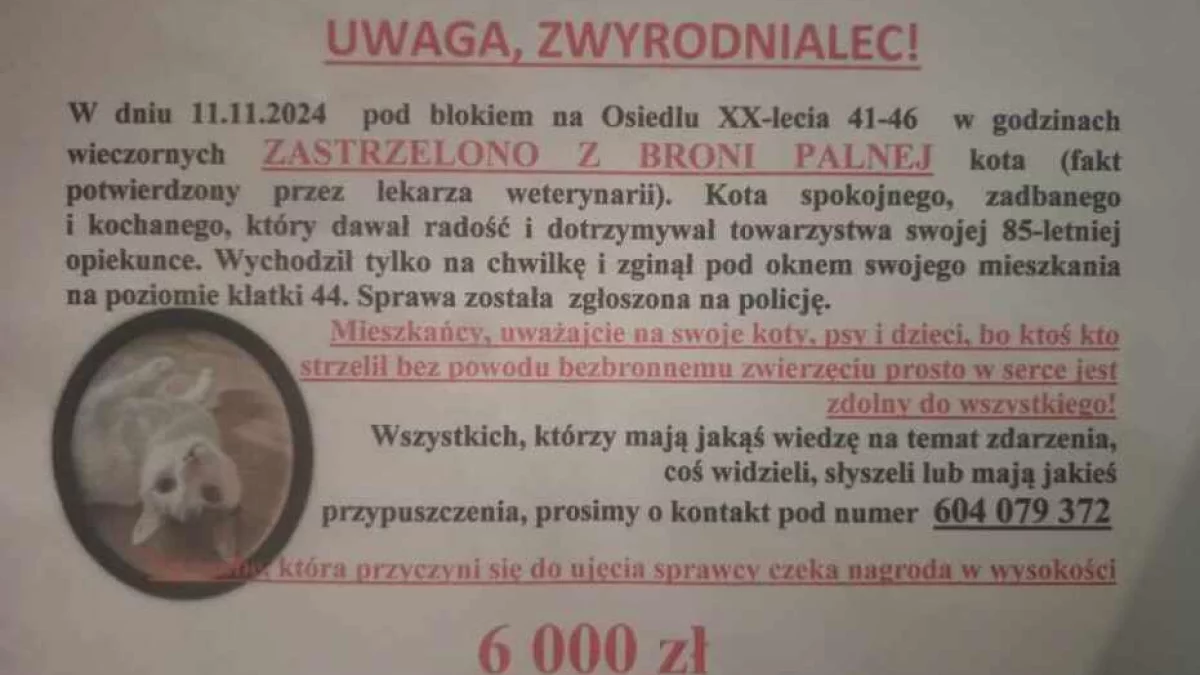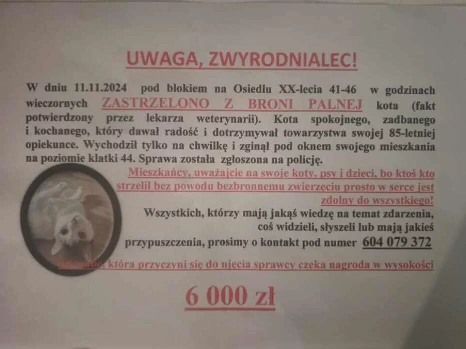 - Zrobiliśmy ogłoszenia. My jako rodzina złożyliśmy się na nagrodę w wysokości 3 tys. Zgłosił się do nas także pan, który chce pozostać anonimowy i on dołożył kolejne 3 tys. Także nagroda jest dosyć wysoka. Ale na razie nie ma żadnego sygnału. Owszem, są telefony od oburzonych ludzi, którzy zastanawiają się jak to możliwe, że w centrum miasta, ktoś strzelał z broni a policja umorzyła śledztwo. Zdarzają się także telefony od ludzi, którzy oferują nam nowego kotka, skoro straciliśmy ukochane zwierzę. Nam jednak chodzi o konkretne informacje o człowieku, który strzelał – mówi właścicielka kota.